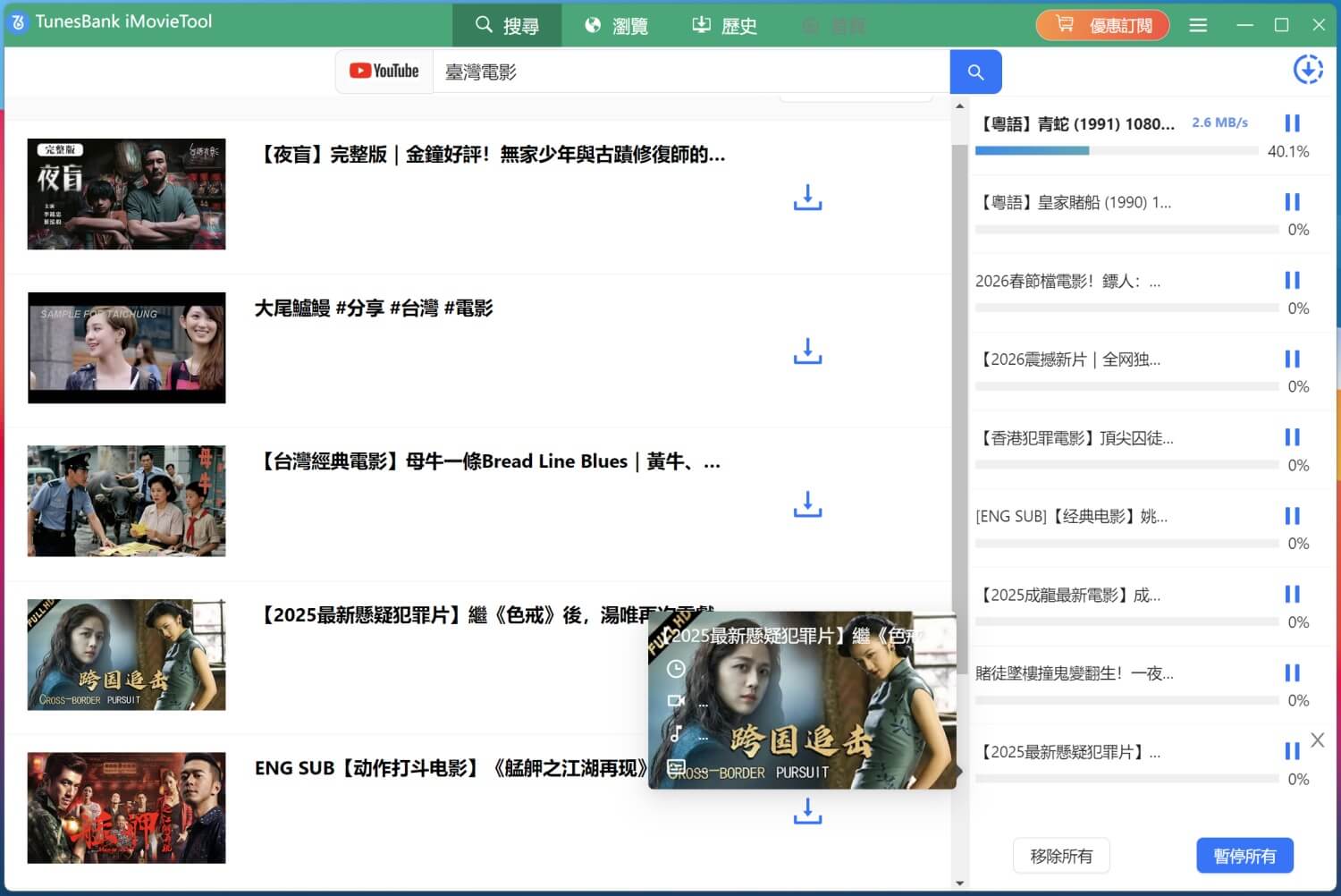 iMovieTool YouTube 影片下載器是一款專業「YouTube 電影下載器」,與 Windows 和 Mac 作業系統完美相容,可以為您解除所有限制。這款下載器不僅可以將購買的、租借的電影和劇集下載到電腦,還可以從 YouTube「電影和電視」版塊下載免費電影,讓您永久珍藏 YT 影片到 Windows 電腦(筆記型電腦)和 Mac 電腦,甚至可以將下載的影片傳輸到其他裝置隨時隨地離線播放。