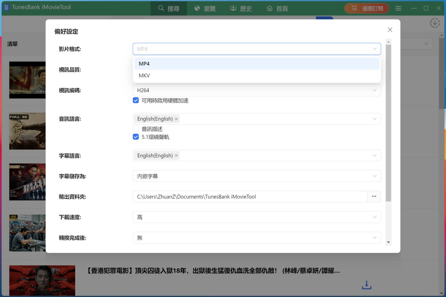 iMovieTool YouTube 影片下載器可以打破串流媒體服務下載限制!它支援從「電影和電視」版塊下載分辨率高達 1080p 的 YouTube 電影/影集/節目,甚至達 4k 超高清畫質(原片有提供的話)。iMovieTool 下載器提供多種視訊畫質和音訊品質選項,您可以根據自己的喜好,選擇以 1080p、720p 和 480p 的解析度下載 YouTube 電影,並支援 AAC 2.0 音軌。